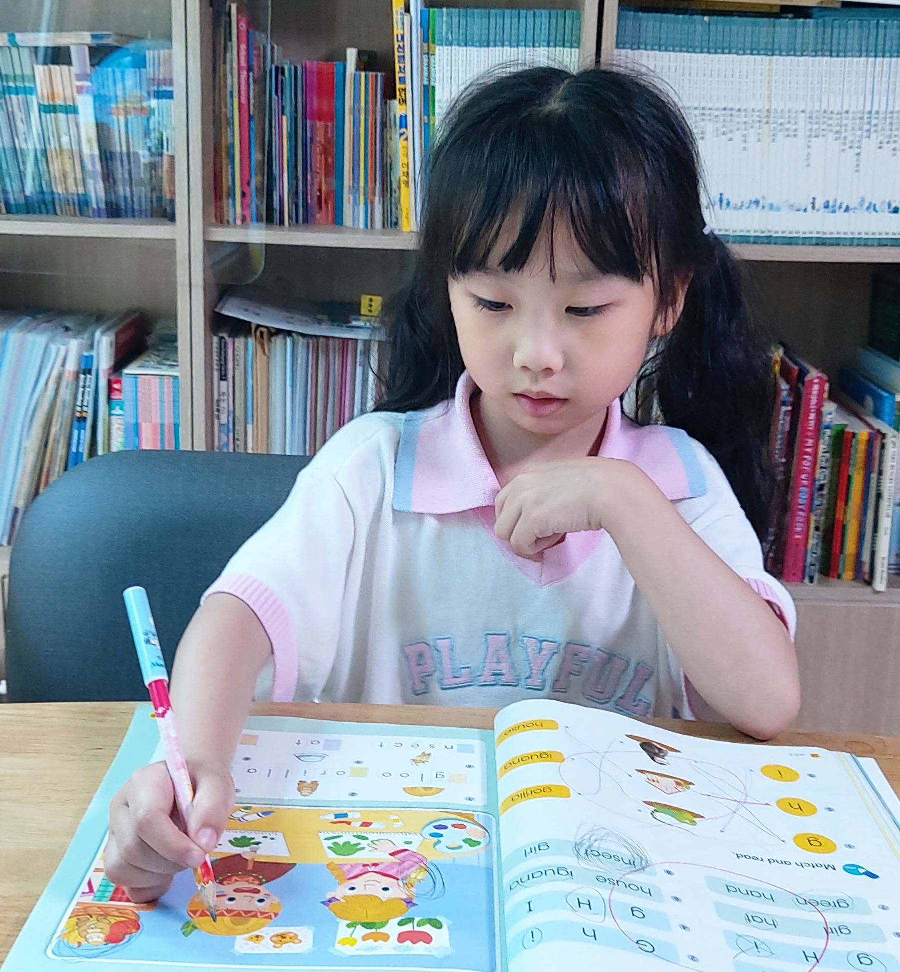 Lesson Lesson 수업내용 소개 수업 개요 슬로건:즐겁게 익히는 영어 학습 주요 대상:만6세부터 초등학교6학년 수업내용:알파벳, 파닉스, 발음교정, 리딩, 스피킹, 액티비티 수업목표:외국어로써의 영어가 아닌 제2국어로써의 영어로 습득 파닉스 리 딩 액티비티 Feature 01 알파블록스를 도입한 파닉스수업 애니메이션 + 워크북 + 장난감 퍼즐로 재미있고 효과적인 수업아이가 캐릭터와 함께 자연스럽게 소리를 습득수업 시 구체적인 발음교정으로 정확한 소리 인식한국식 발음에서 벗어나 깨끗한 영국식 발음으로 성장 알파블록스의 효과 아이들이 캐릭터와 함께 소리를 자연스럽게 배웁니다.알파벳 캐릭터들이 손을 잡고 단어가 만들어지는 과정을 눈으로 직접 확인합니다.반복되는 대사와 리듬감 있는 노래를 통해 아이들이 적극적으로 참여할 수 있습니다.여려운 단어로 진행되어도 공부처럼 느끼지 않고 자연스럽게 익힐 수 있습니다. Feature 02 Oxford Reading Tree 리딩 아이의 읽기 수준의 맞춘 단계별 구성아이의 읽기 수준에 따라 STAGE1 – 9로 체계적인 수업이 진행되며 워크북으로 중요 표현을 확인할 수 있습니다.반복되는 표현과 구조로 읽기 유창성 강화같은 어휘와 문장 구조가 반복적으로 등장해, 읽기에 자신감이 생기고 자연스럽게 속도와 정확성이 향상됩니다. Dialogic Reading 대화식 리딩 리딩학습을 바탕으로 스피킹 연습과 연계 일정한 읽기 수준을 채운 아이에게는 대화식 리딩 수업을 도입합니다. 읽은 내용에 대해 선생님과 간단한 대화를 나눕니다. 이것은 읽기로 얻은 지식을 정리하며 밖으로 전달하는 능력을 조성하는데에 가장 효과가 있는 방식입니다. Feature 03 액티비티수업 Cambridge 출판사의 교재 및 주한 영국문화원 자료 등을 사용해, 카드놀이, 그림사전, 빙고게임, 퀴즈, 퍼즐 등 다양한 언어활동 진행 영어 놀이활동을 함께 진행하는 이유 미국 아동발달 심리학자인 Dr. Purvis 박사에 따르면 일반 학습보다 놀이활동은 아이의 뇌에 새로운 신경 연줄을 최대 7배 더 빠르게 만들어 학습 효과를 높여줍니다.